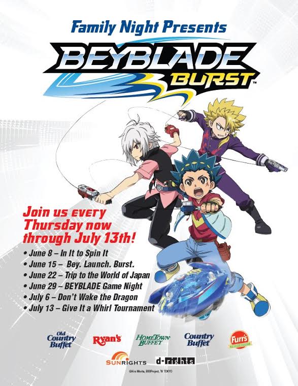 Ovation Brand’s (Old Country Buffet, Ryan’s, Hometown Buffet, Country Buffet – and Furr’s Fresh Buffet) have a great set of family nights lined up again and this time it is in conjunction with Beyblade Burst!